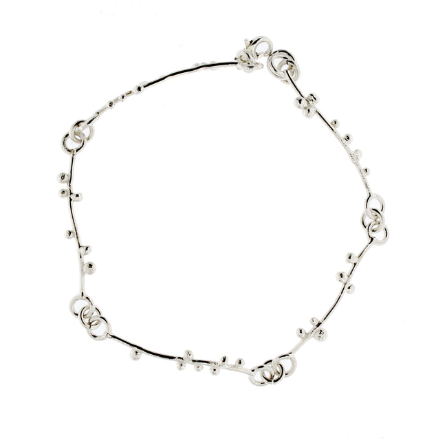 Handmade Sterling silver "branches" with bud-like fused spheres, joined by Sterling silver jump rings, and featuring a Sterling silver lobster clasp closure.