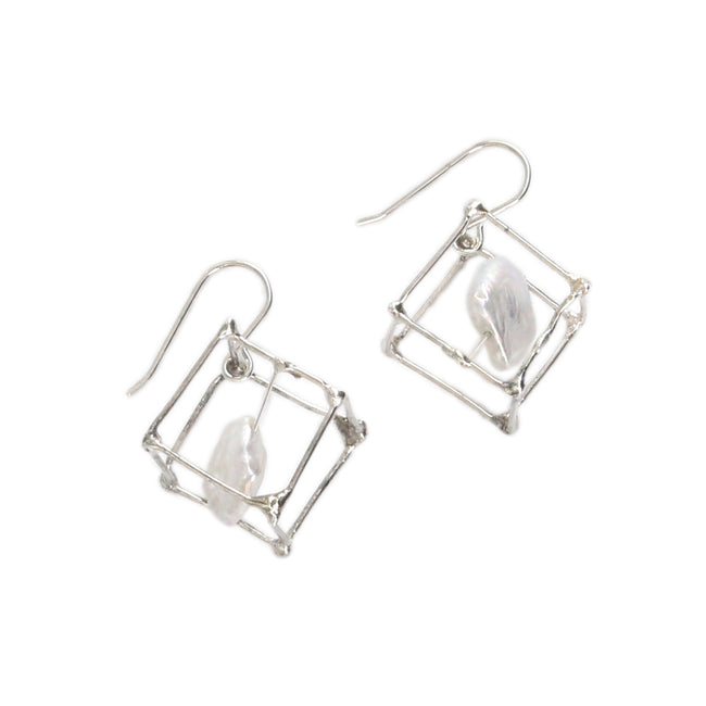 Cube & pearl earrings, sculptural, hand made sliver cubes with coin pearls, available in cube sizes small to large, designed and hand made by Elizabete Ludviks