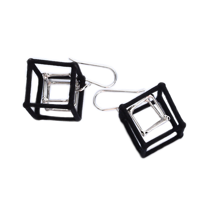 2 Cube earrings in 3D printed hand dyed BLACK nylon with a Sterling silver ("WHITE") cube nesting inside.