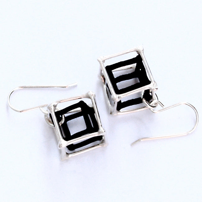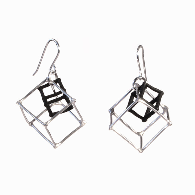 2 Cube earrings in handmade Sterling silver ("WHITE") with a 3D printed hand dyed BLACK nylon cube nesting inside.