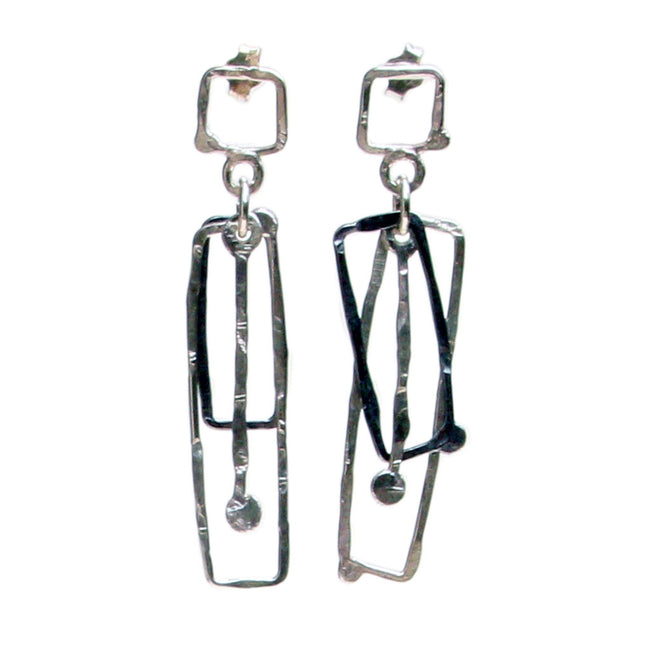 Mixed hammered polished and oxidized Sterling silver earrings in combinations of 2 elongated rectangular hoops and a hammered wire "stick".