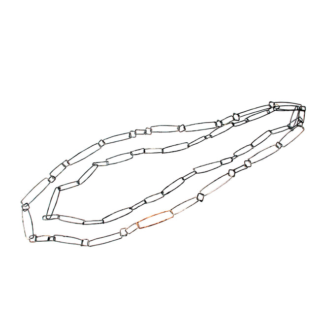 Mixed hammered oxidized Sterling silver with copper accents. Double strand in combinations of an elongated rectangular hoops and small squares.