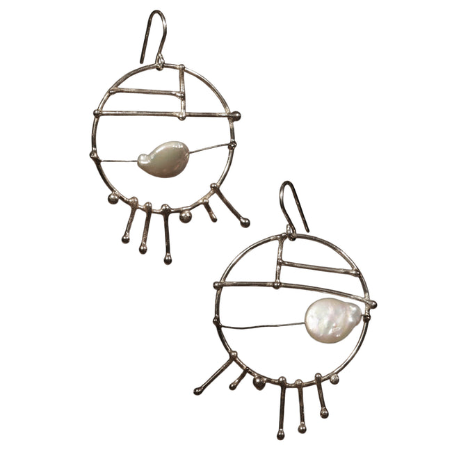 Pearl in wheel earrings, sculptural, hand made silver wheels with coin pearl, available in wheel sizes small to large, designed by Elizabete Ludviks