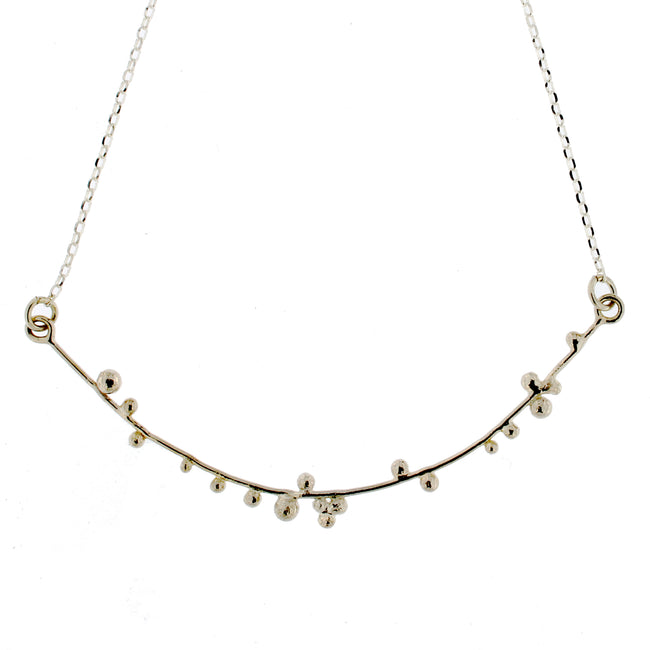 Handmade Sterling silver "branch" with bud-like fused spheres, on a fine Sterling silver chain. Each pendant is composed of a curved crescent