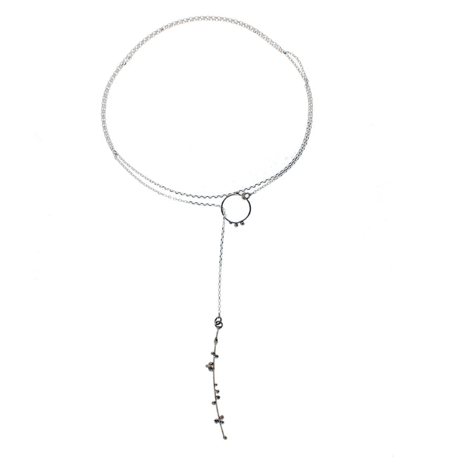 Handmade Sterling one or two silver "branches" with bud-like fused spheres on a fine Sterling silver chain, that PULL THROUGH a circular "bloom", allowing for adjustable lengths.