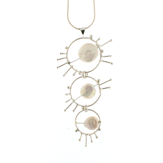 Pearl in wheel pendant, sculptural, hand made sliver wheel with coin pearl, cascading from large to small on snake chain, available in wheel sizes small to large, designed by Elizabete Ludviks