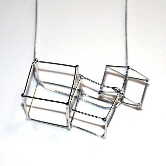 Sculptural handmade pendants with three cascading Sterling silver cubes.