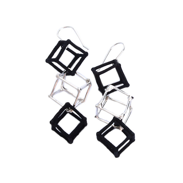 3 Cube cascading earrings with two 3D printed hand dyed BLACK nylon cubes and a handmade Sterling silver ("WHITE") cube in between.