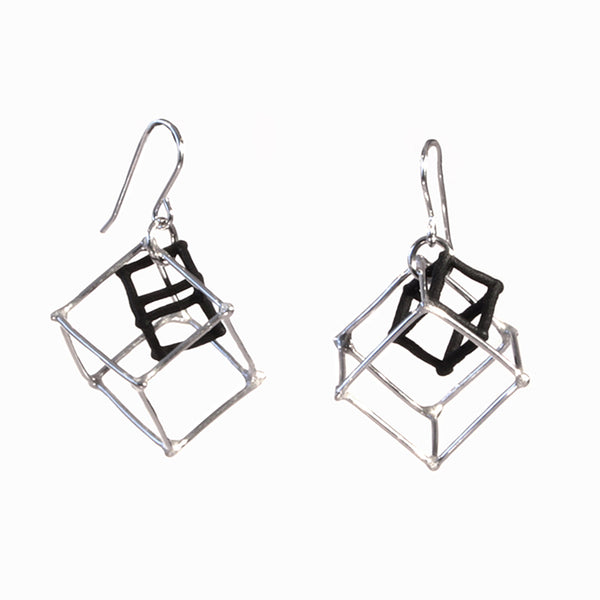 2 Cube earrings in handmade Sterling silver ("WHITE") with a 3D printed hand dyed BLACK nylon cube nesting inside.