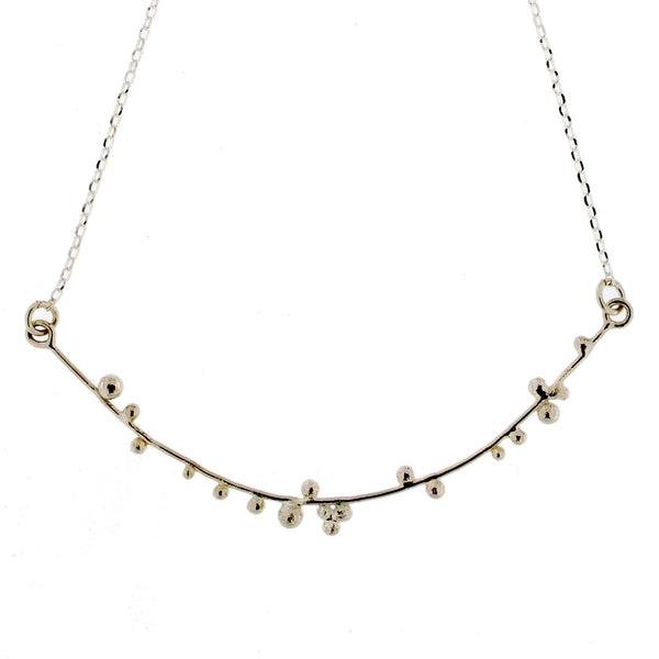 Handmade Sterling silver "branch" with bud-like fused spheres, on a fine Sterling silver chain. Each pendant is composed of a curved crescent