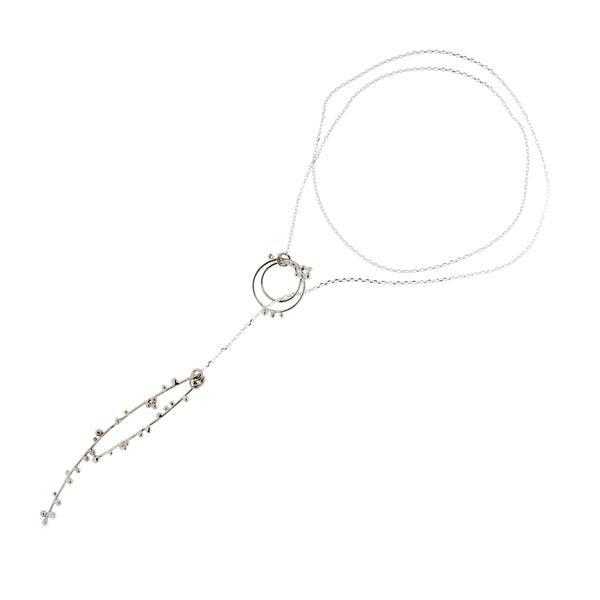 Handmade Sterling one or two silver "branches" with bud-like fused spheres on a fine Sterling silver chain, that PULL THROUGH a circular "bloom", allowing for adjustable lengths.