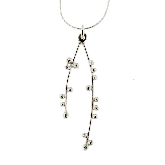 Handmade Sterling silver "branches" with bud-like fused spheres, on a Sterling silver snake chain. Each pendant is composed of a fused twin-branched "wishbone".