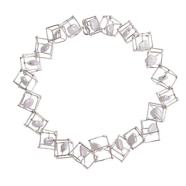 Cube & pearl necklace, sculptural, hand made sliver cubes with coin pearls, available in lengths 16" to 75", designed and hand made by Elizabete Ludviks