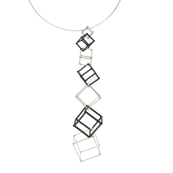 CUBE - WHITE & BLACK pendant, with 7 (in total) 3D printed hand dyed BLACK nylon cubes and handmade Sterling silver ("WHITE") cubes.
