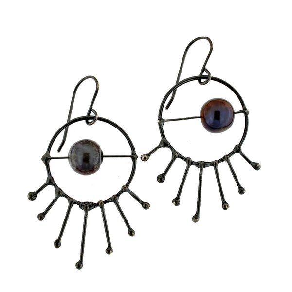 Pearl in wheel earrings, sculptural, hand made silver wheels with coin pearl, available in wheel sizes small to large, designed by Elizabete Ludviks