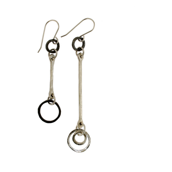 Inspired by the Mid Century mobiles of Alexander Calder and the natural world around us, the series consists of *MISMATCHED* pairs of earrings, each with a visual balance, as well as pendants on Sterling silver fine link or snake chains, and necklaces on hand-forged Sterling silver neck torques.