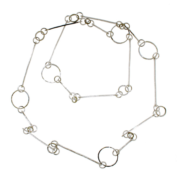 39" long necklace with cast Sterling silver elements.