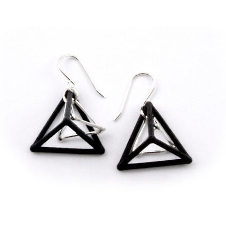 2 Triangle earrings in 3D printed hand dyed BLACK nylon with a Sterling silver ("WHITE") triangle nesting inside.