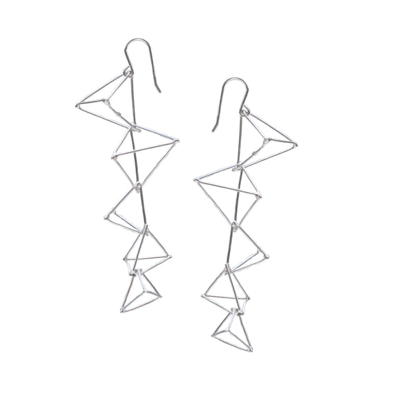 Sculptural handmade earrings with 7 cascading Sterling silver triangles.