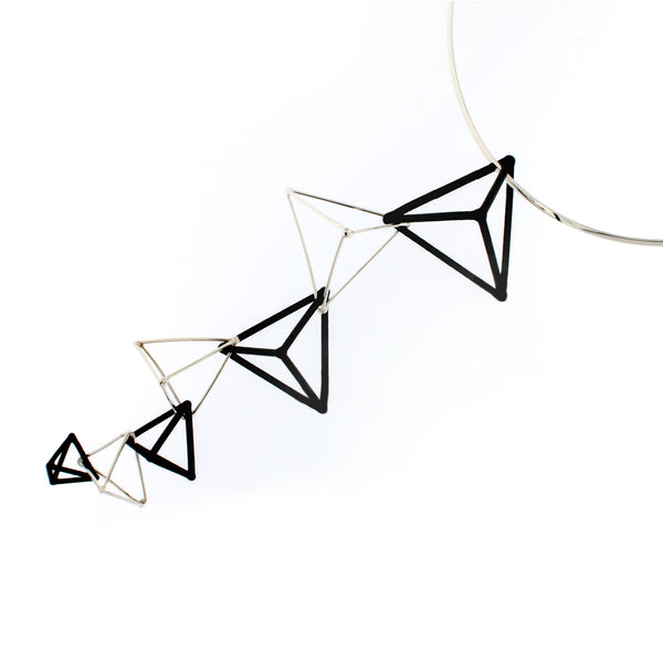Pendant, with 7 (in total) handmade Sterling silver ("WHITE") triangles and 3D printed hand dyed BLACK nylon triangles.